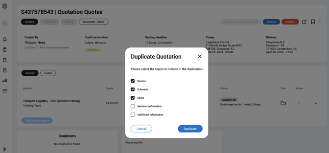 You will receive a prompt asking which information you would like to transfer to the new quote. Choose the specific details you require for the duplicated quote.
